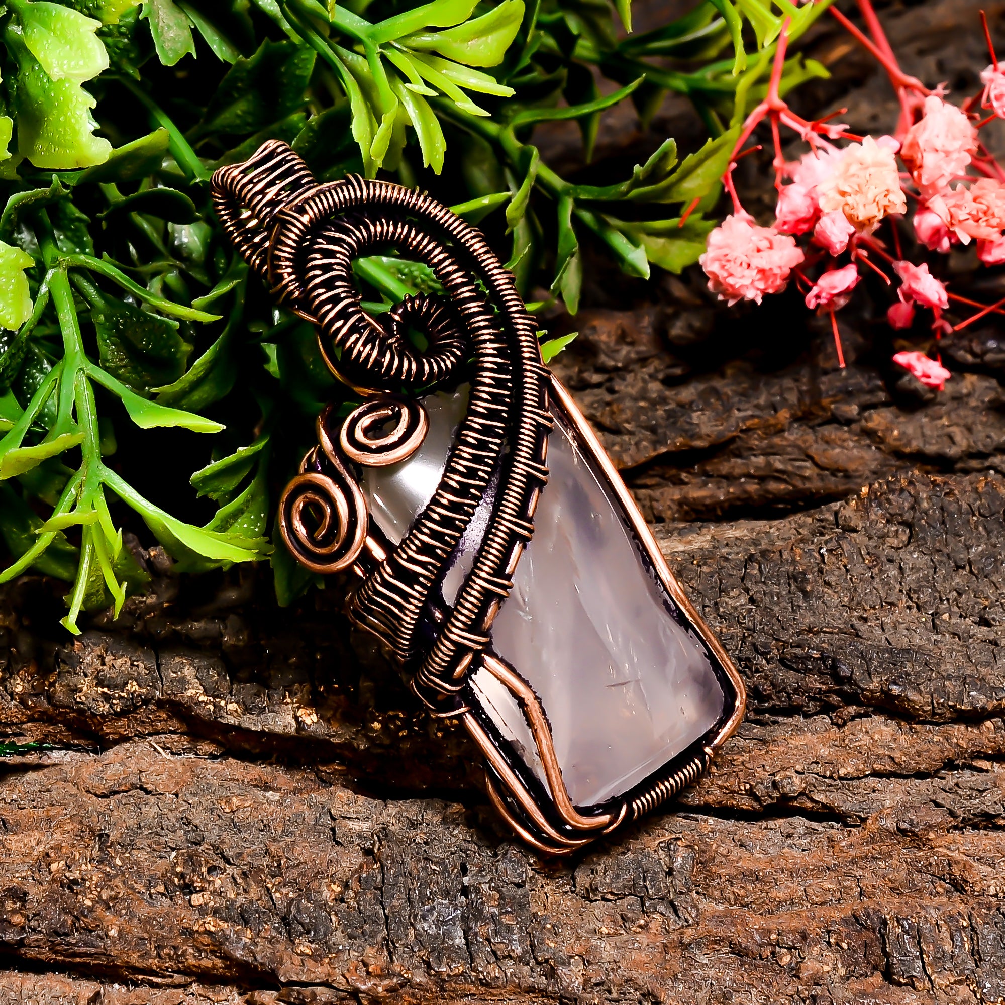 Fantastic Top Grade Quality 100% Natural Rose Quartz Gemstone Radiant Vintage Handmade Pure Copper Wire Wrapped Pendant 2" 16.8 gms. KR10-11