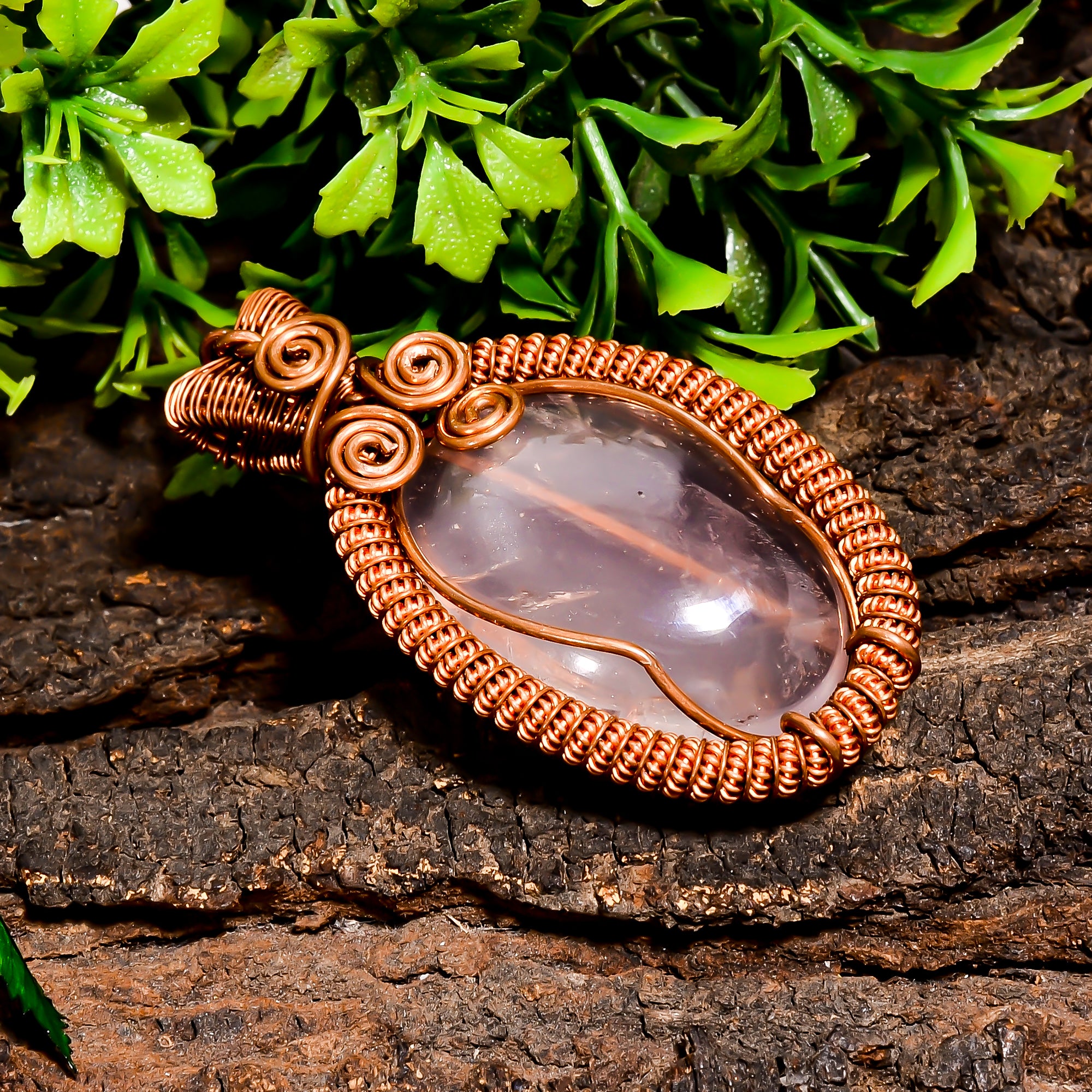 Incredible Top Grade Quality 100% Natural Rose Quartz Gemstone Oval Vintage Handmade Pure Copper Wire Wrapped Pendant 2.2" 25.3 gms. KR10-64