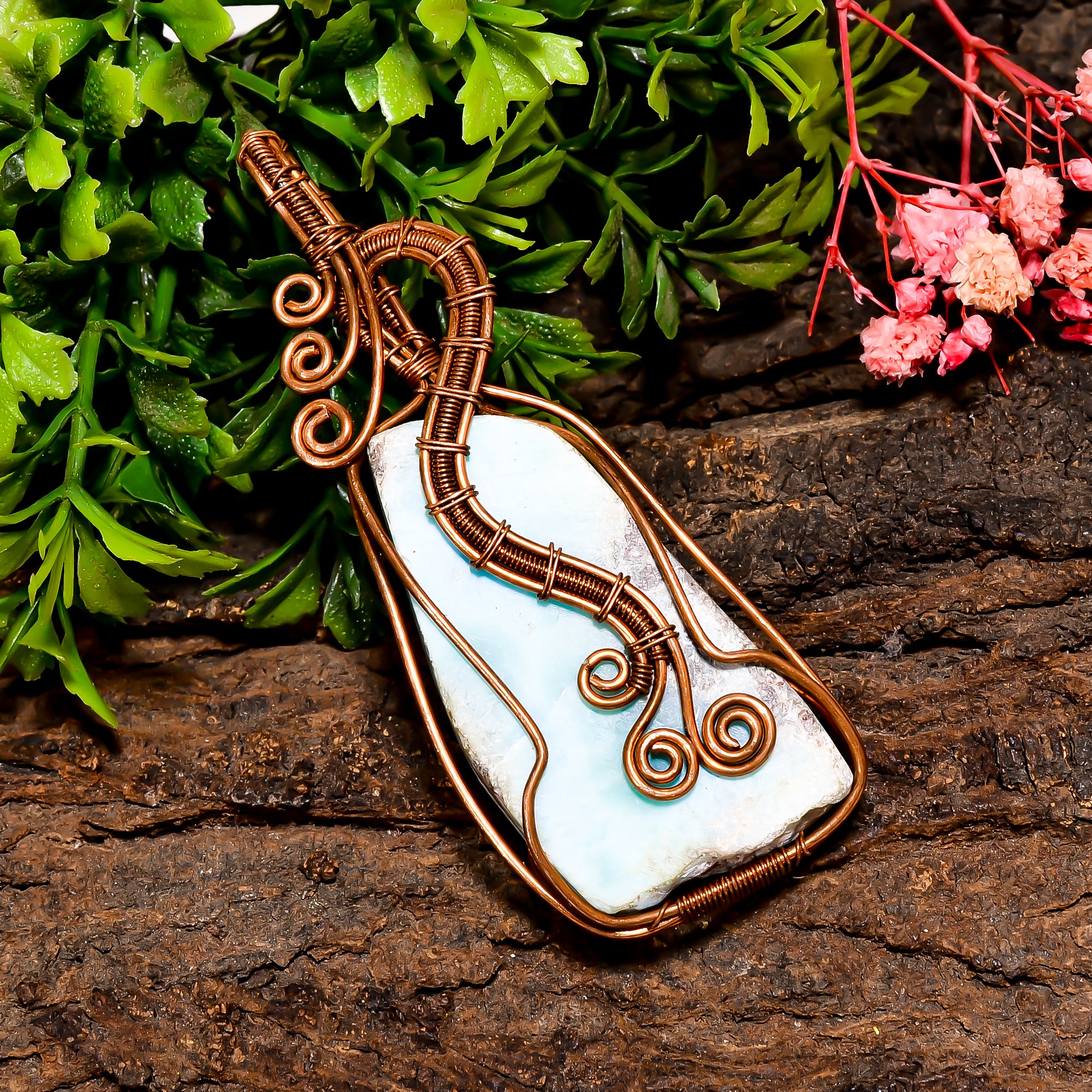 Outstanding Top Grade Quality 100% Natural Larimar Gemstone Vintage Handmade Jewelry Pure Copper Wire Wrapped Pendant 2.8" 28.5 gms. KR09-67 Sunkarton