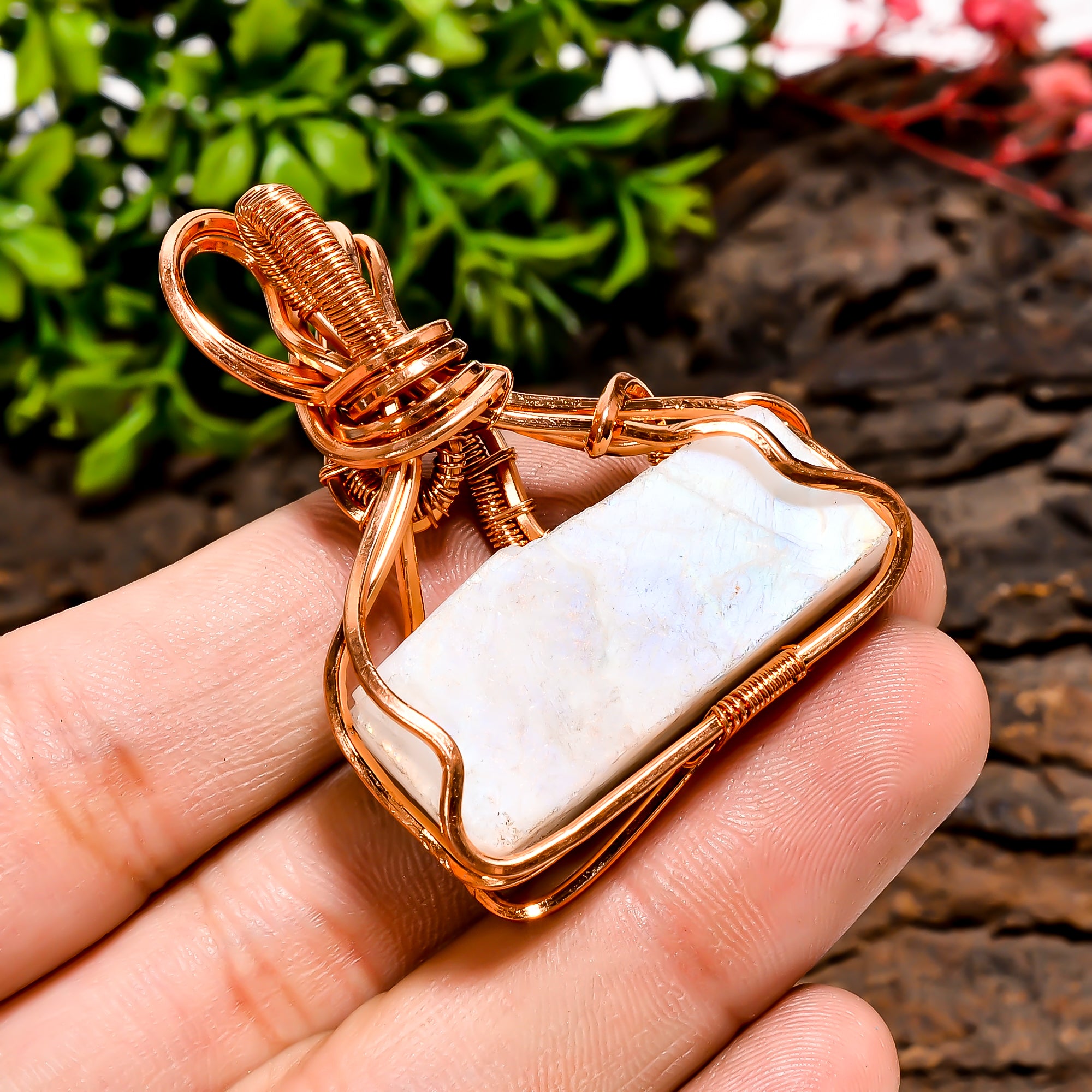 Superb A One Quality 100% Natural Rainbow Moonstone Gemstone Fancy Vintage Handmade Pure Copper Wire Wrapped Pendant 1.9" 21.4 gms. KR10-94