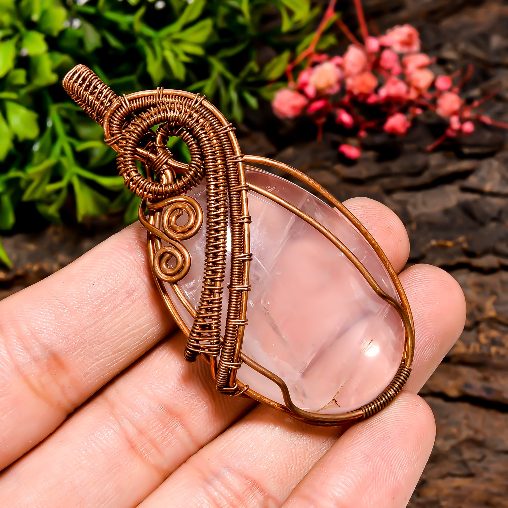 Supreme Top Grade Quality 100% Natural Rose Quartz Gemstone Oval Vintage Handmade Pure Copper Wire Wrapped Pendant 2.6" 26.6 gms. KR10-21
