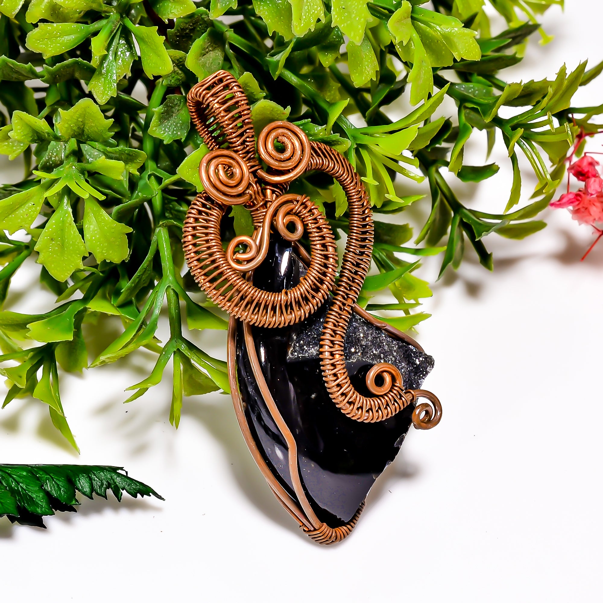 Amazing A One Quality 100% Natural Black Druzy Gemstone Vintage Style Handmade Jewelry Pure Copper Wire Wrapped Pendant 2.4" 17.8 gms KR1151
