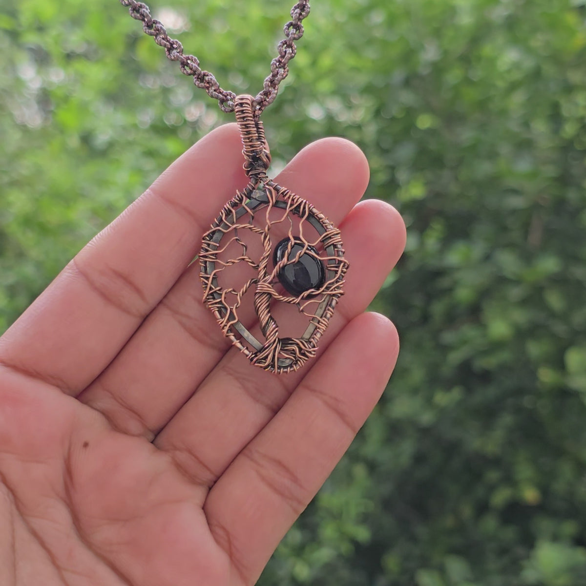 Black Onyx Gemstone Handmade Copper Wire Wrap Chain Pendant 2.36"