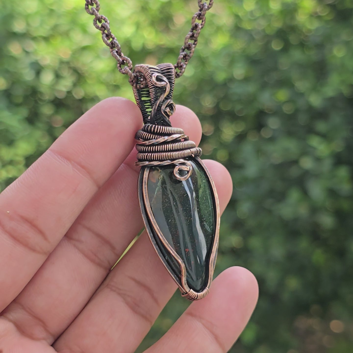 Bloodstone Gemstone Handmade Copper Wire Wrap Chain Pendant 2.55"