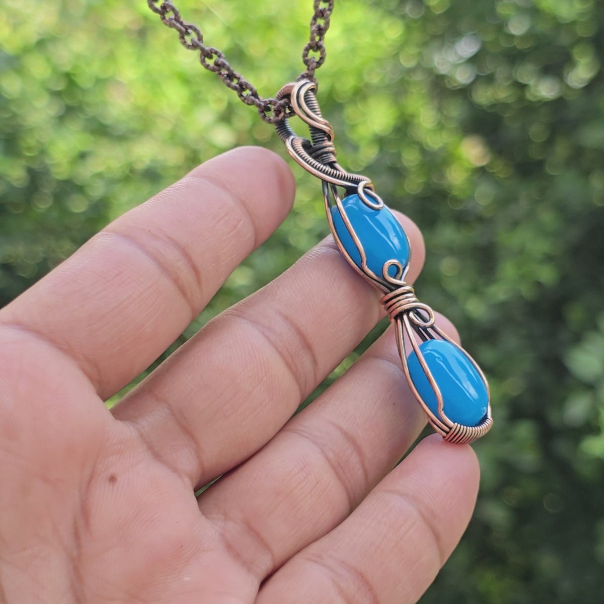 Blue Chalcedony Gemstone Handmade Copper Wire Wrap Chain Pendant 2.95"