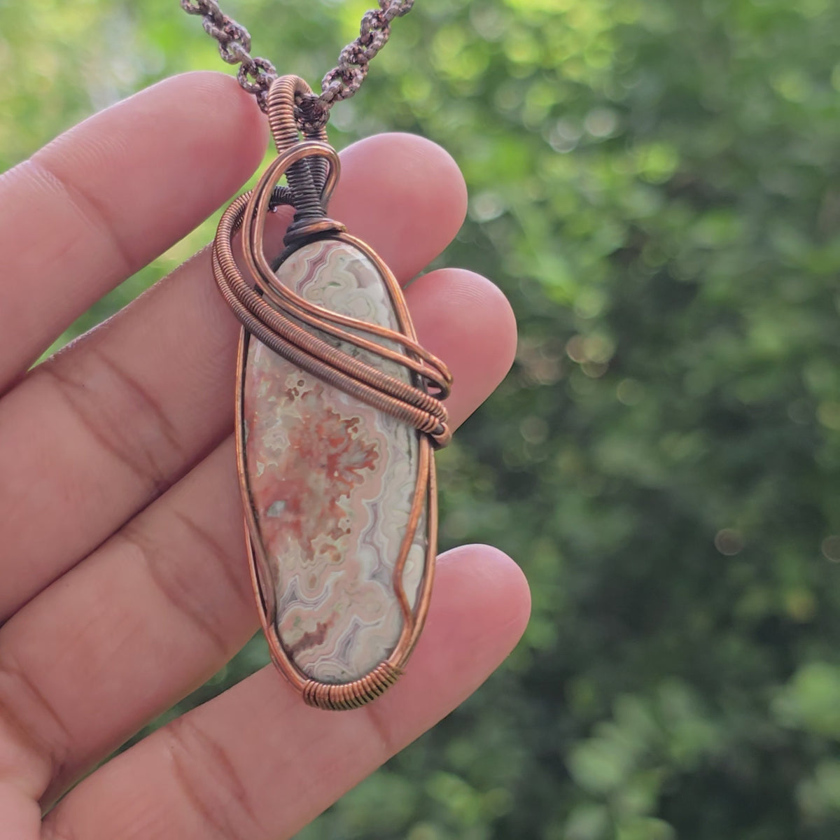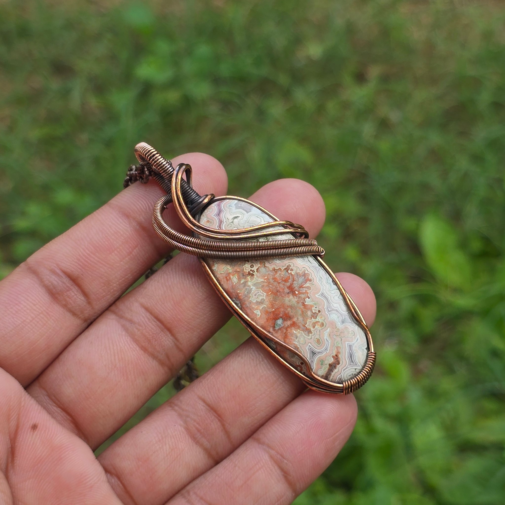 Crazy Lace Agate Gemstone Handmade Copper Wire Wrap Chain Pendant 2.75"