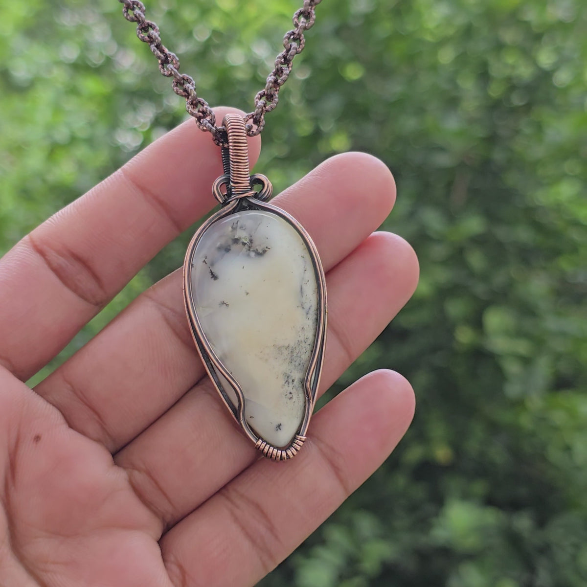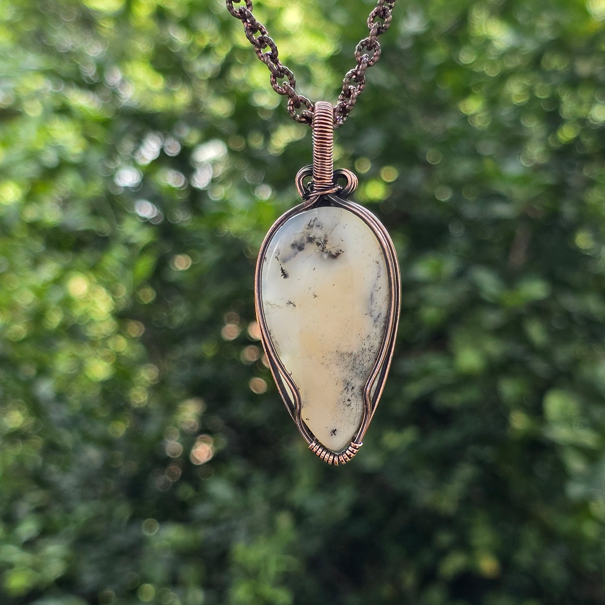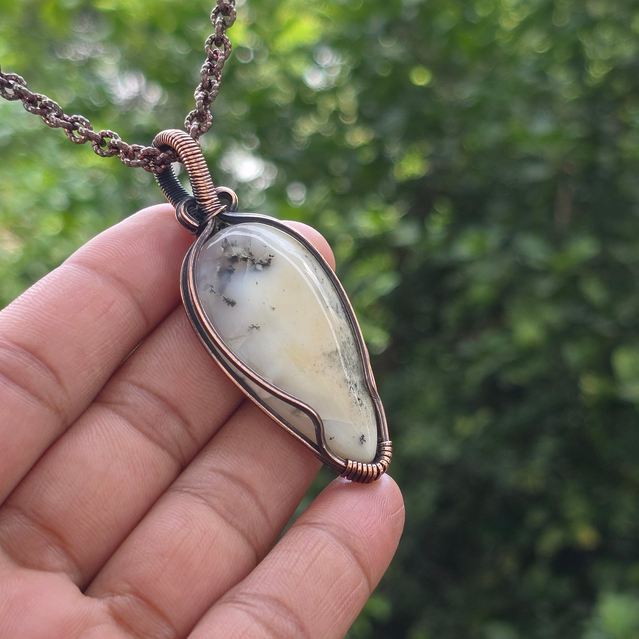 Dendrite Opal Gemstone Handmade Copper Wire Wrap Chain Pendant 2.55"