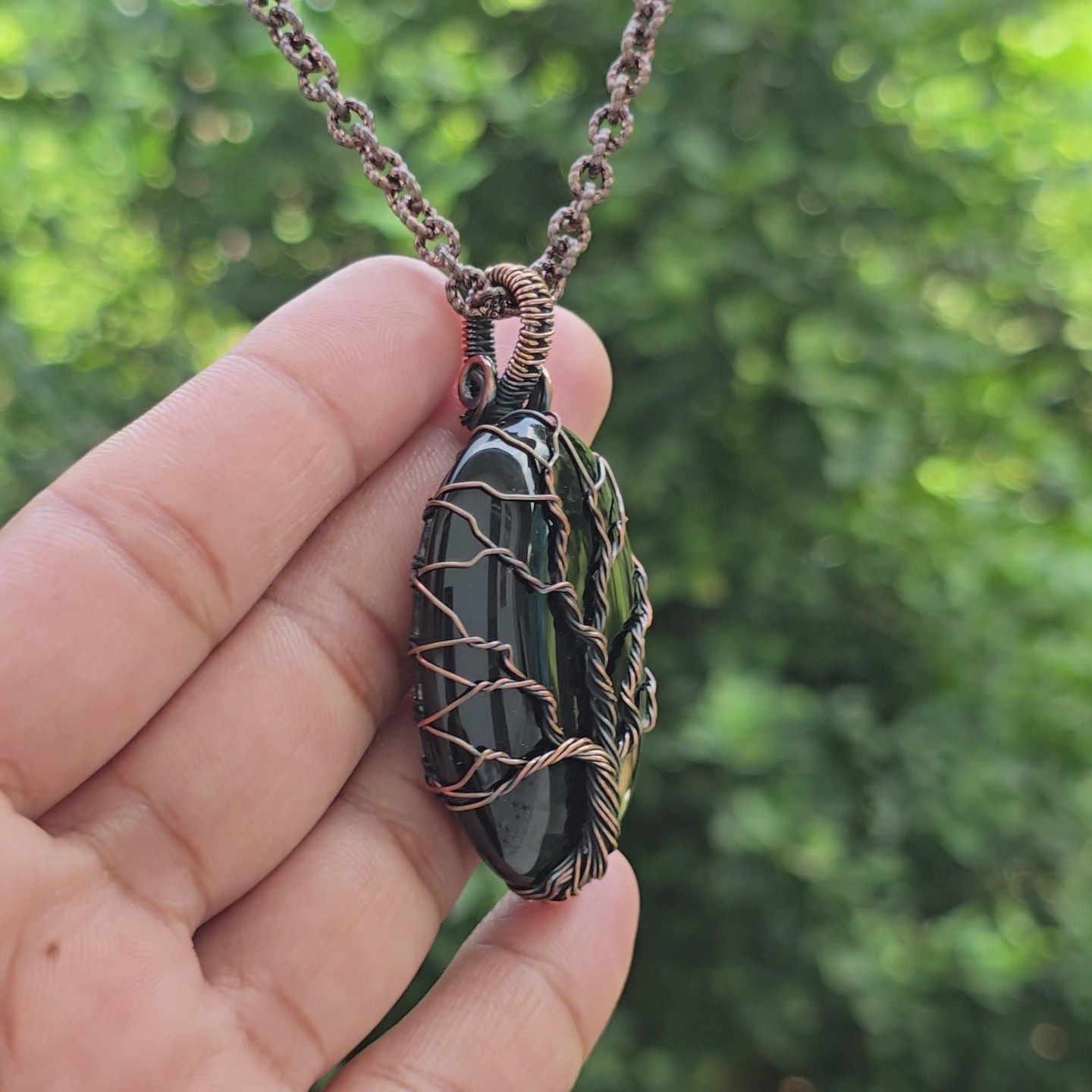 Dendrite Opal Gemstone Handmade Copper Wire Wrap Chain Pendant 2.55"