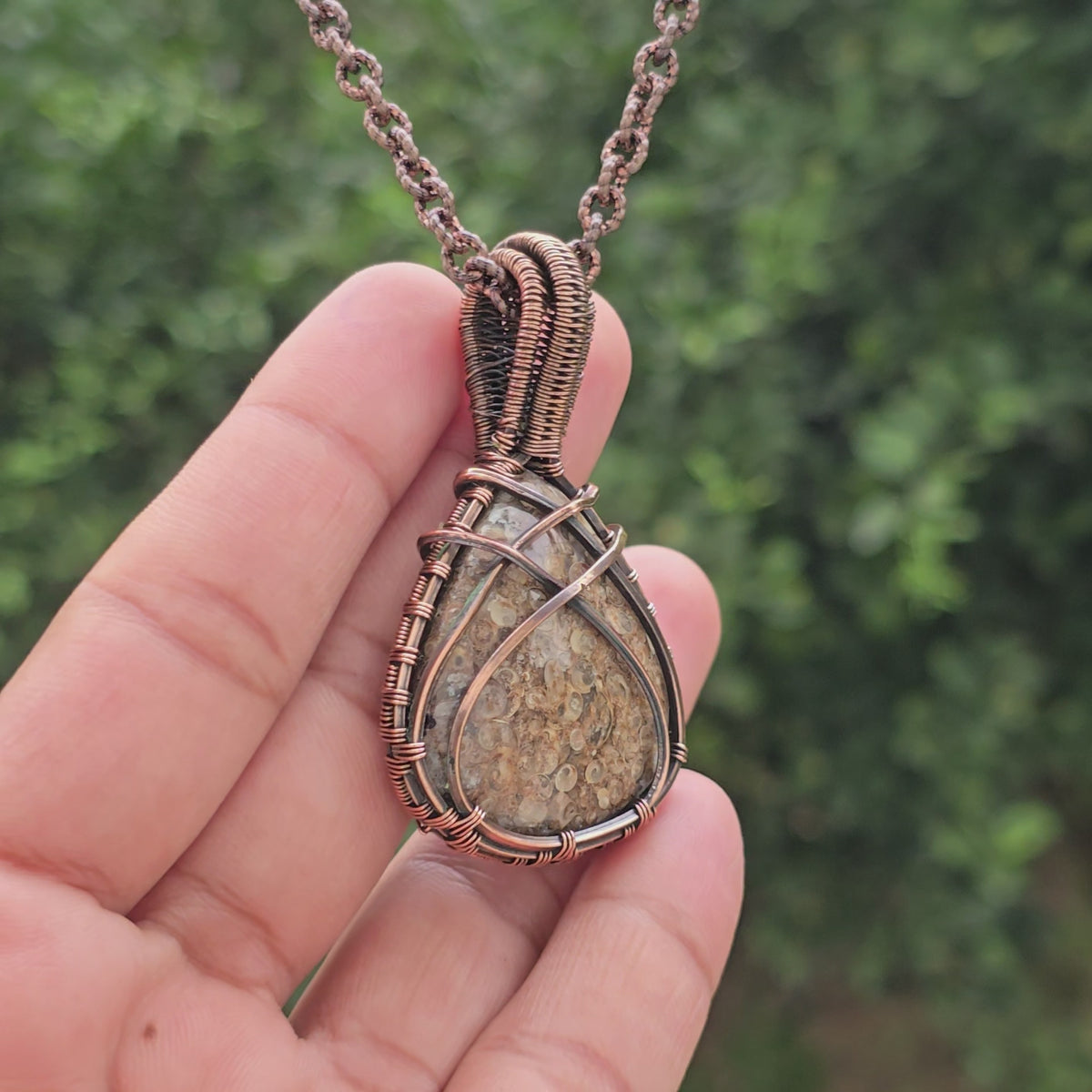 • This stunning Dinosaur Bone Fossil  Copper Wire Wrapped Pendant is a handcrafted piece of bohemian gemstone jewelry. The calming blue hues of Chalcedony are beautifully complemented by the rich tones of oxidized copper wire, making this pendant a perfect mix of elegance and natural beauty.