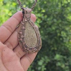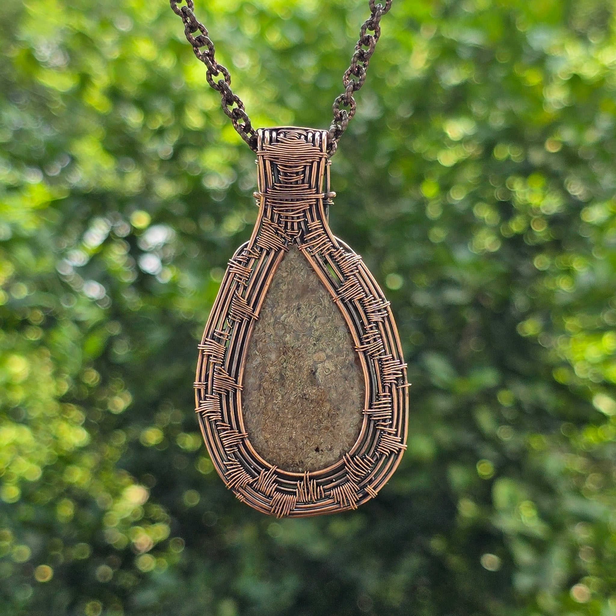 Dinosaur Bone Fossil Gemstone Handmade Copper Wire Wrap Chain Pendant 2.95" Sunkarton