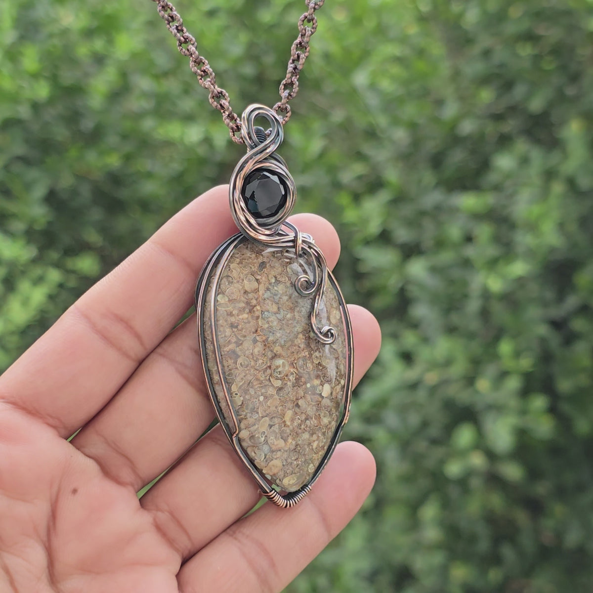 • This stunning Dinosaur Bone Fossil  Copper Wire Wrapped Pendant is a handcrafted piece of bohemian gemstone jewelry. The calming blue hues of Chalcedony are beautifully complemented by the rich tones of oxidized copper wire, making this pendant a perfect mix of elegance and natural beauty.