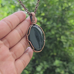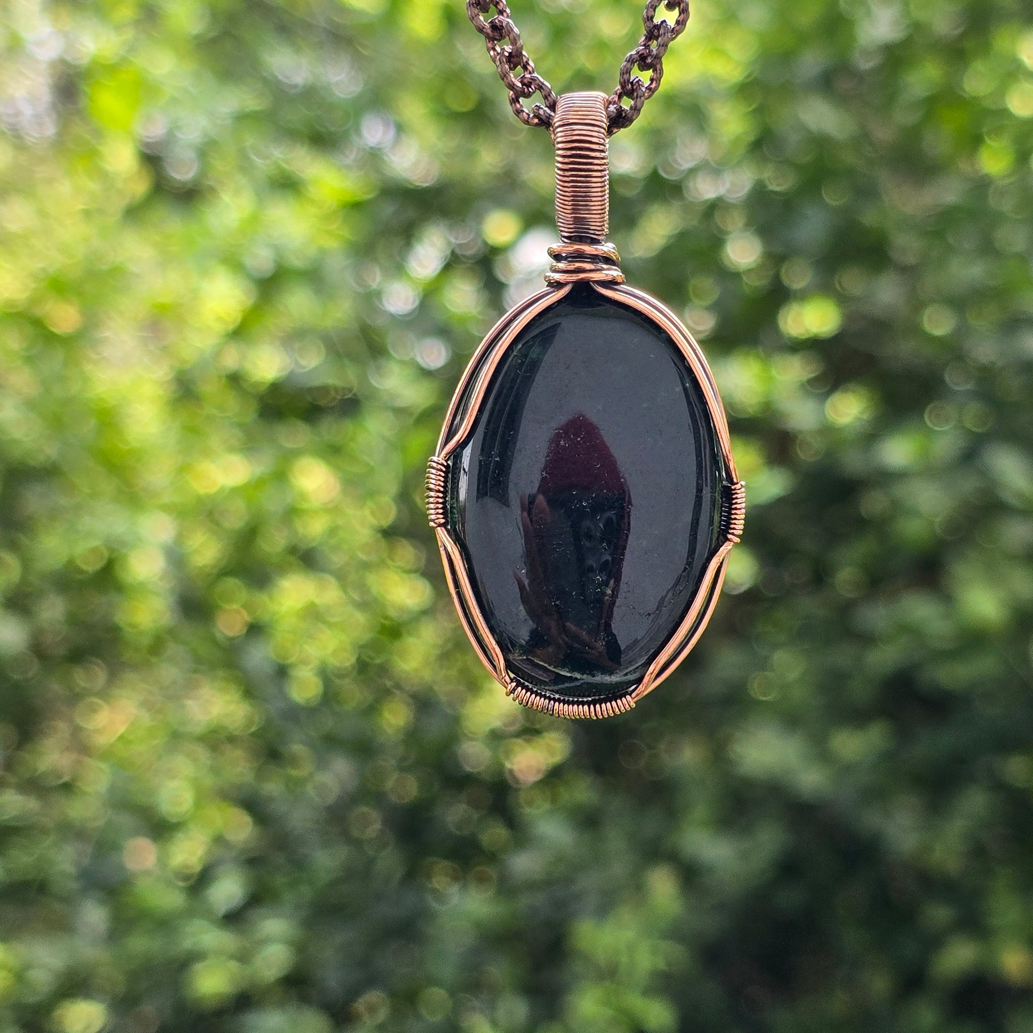 • This stunning Green Moos Agate Gemstone Copper Wire Wrapped Pendant is a handcrafted piece of bohemian gemstone jewelry. The calming blue hues of Chalcedony are beautifully complemented by the rich tones of oxidized copper wire, making this pendant a perfect mix of elegance and natural beauty.