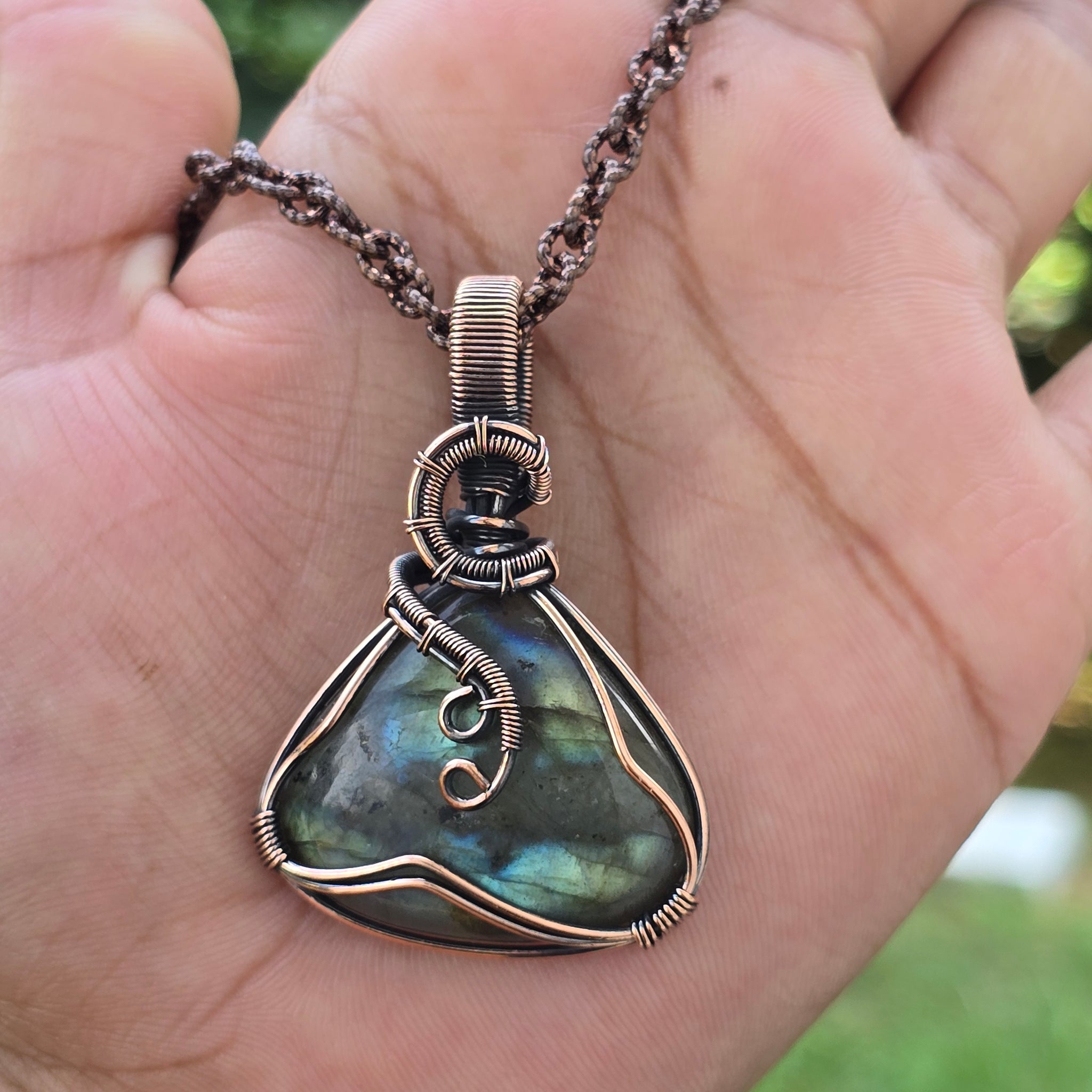 • This stunning Labradorite  Gemstone Copper Wire Wrapped Pendant is a handcrafted piece of bohemian gemstone jewelry. The calming blue hues of Chalcedony are beautifully complemented by the rich tones of oxidized copper wire, making this pendant a perfect mix of elegance and natural beauty.