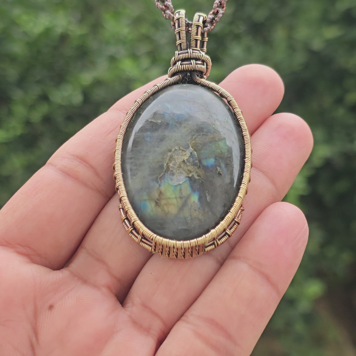 Labradorite Gemstone Handmade Copper Wire Wrap Chain Pendant 2.75"