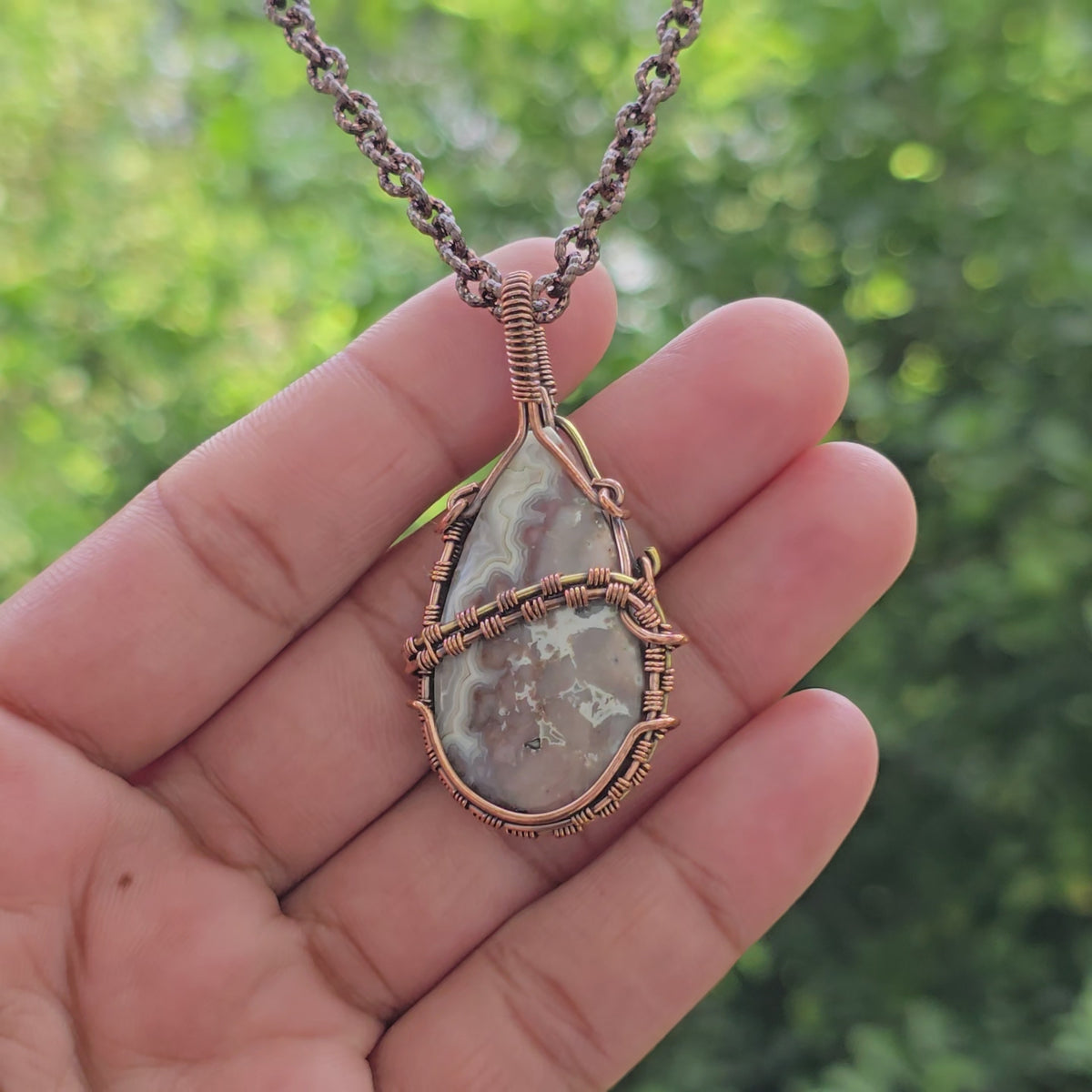 Laguna Lace Agate Gemstone Handmade Copper Wire Wrap Chain Pendant 2.16"