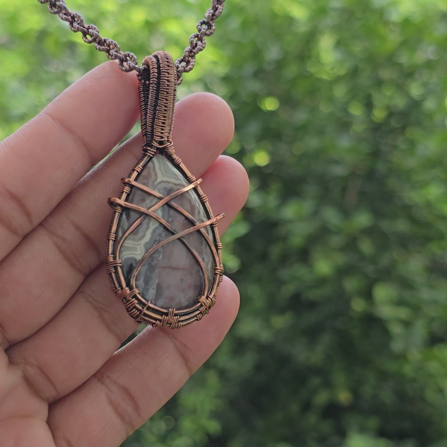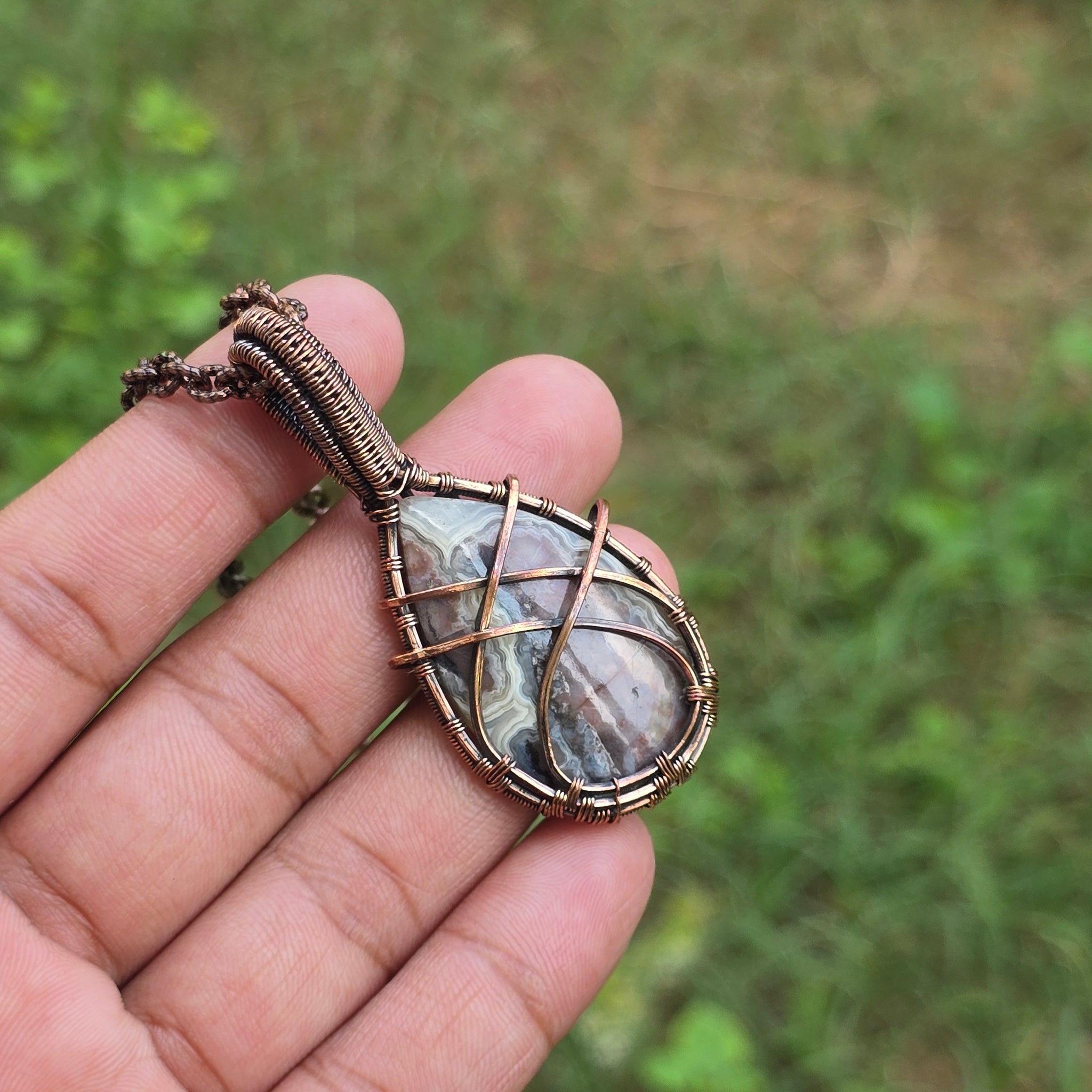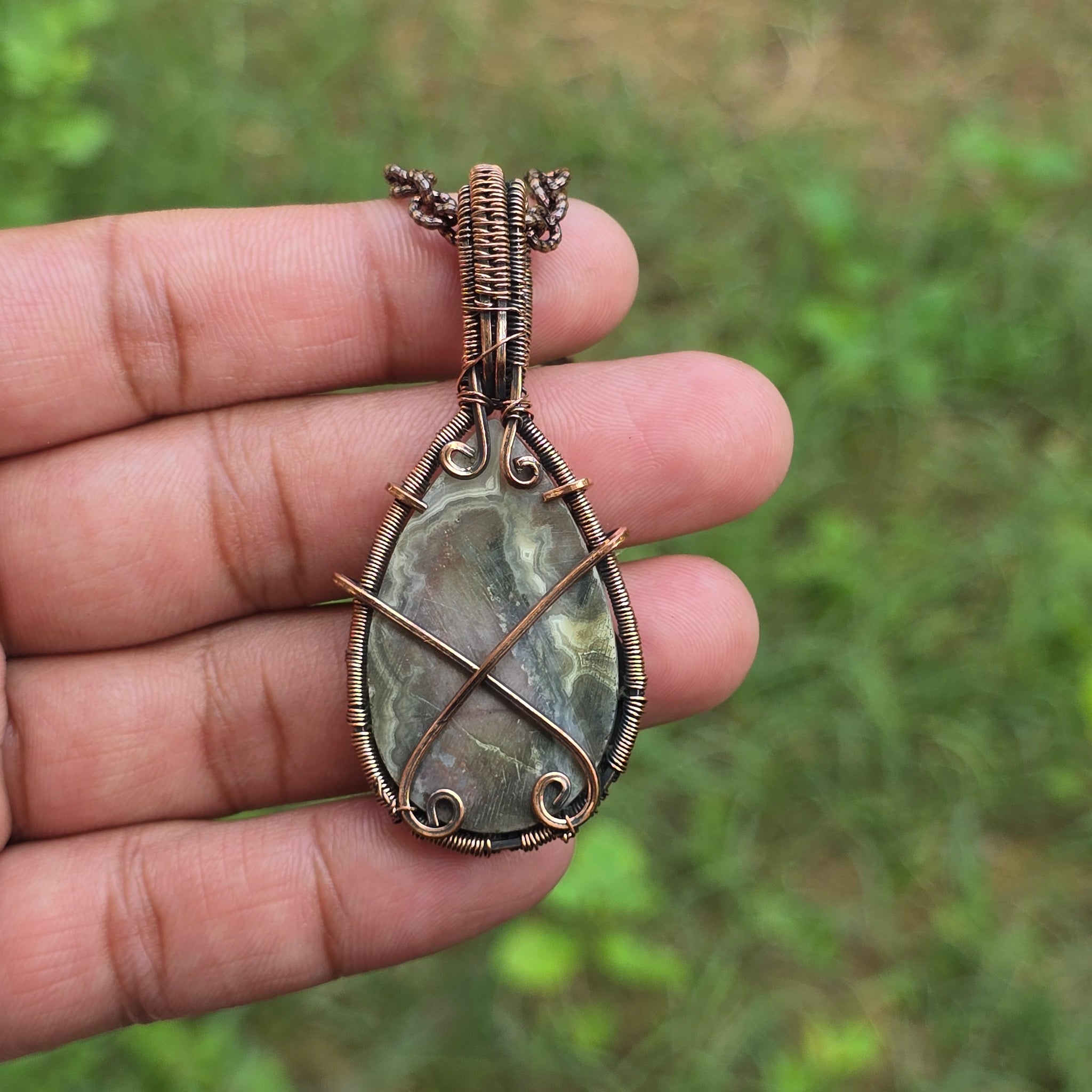 Laguna Lace Agate Gemstone Handmade Copper Wire Wrap Chain Pendant 2.55"