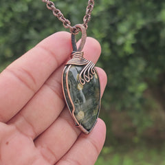 Ocean Jasper Gemstone Handmade Copper Wire Wrap Chain Pendant 2.55"