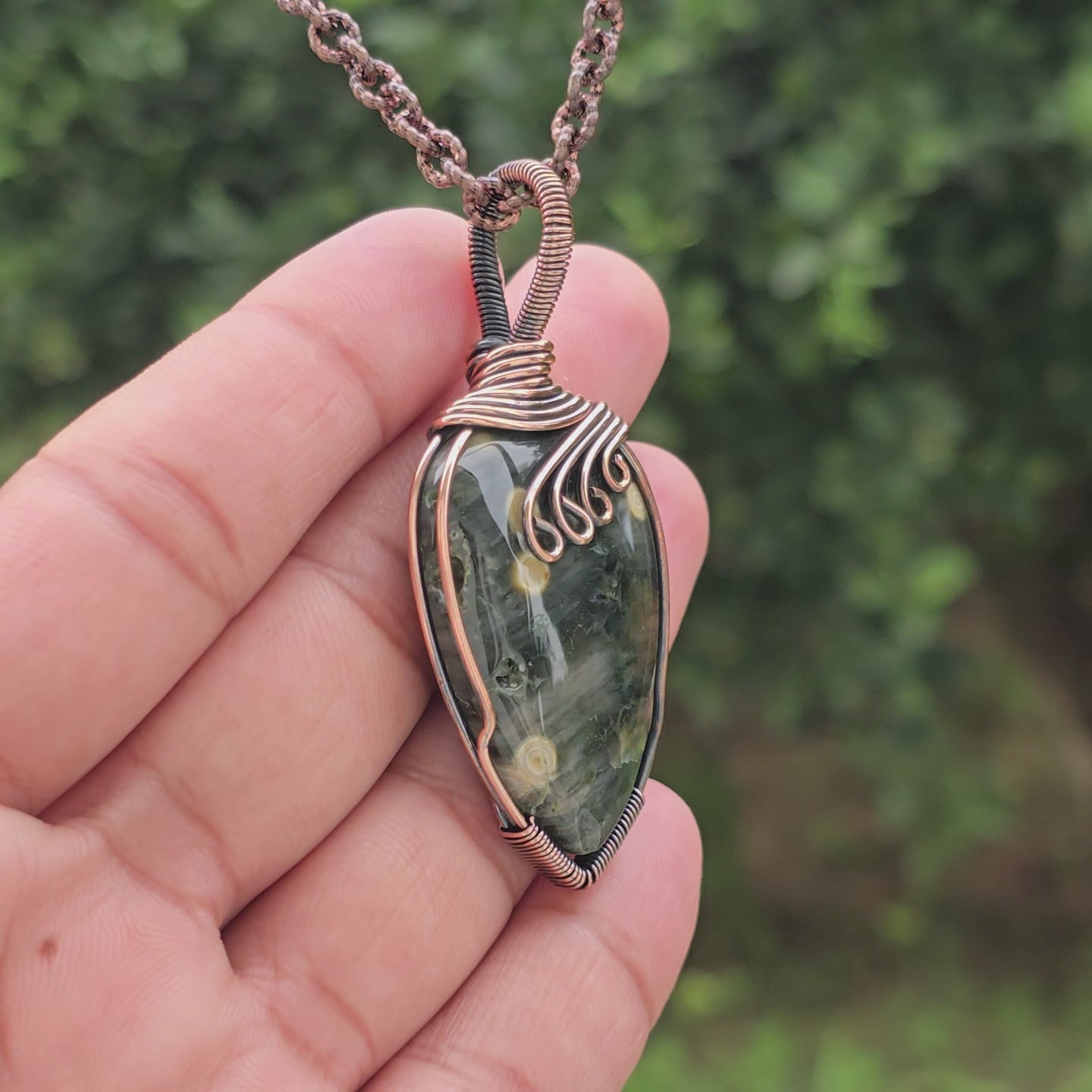 Ocean Jasper Gemstone Handmade Copper Wire Wrap Chain Pendant 2.55" Sunkarton
