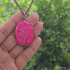 Pink Howlite Gemstone Handmade Copper Wire Wrap Chain Pendant 2.16"