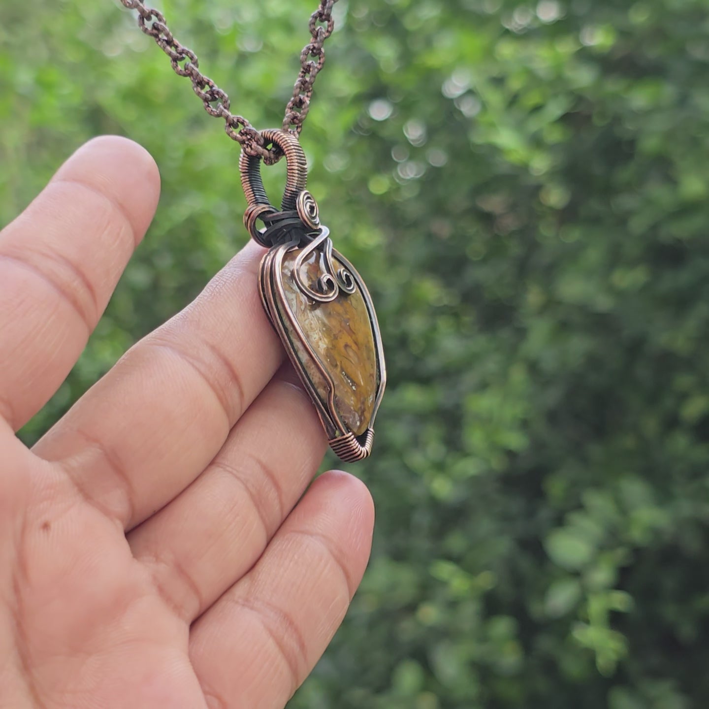 Plume Agate Gemstone Handmade Copper Wire Wrap Chain Pendant 2.36"