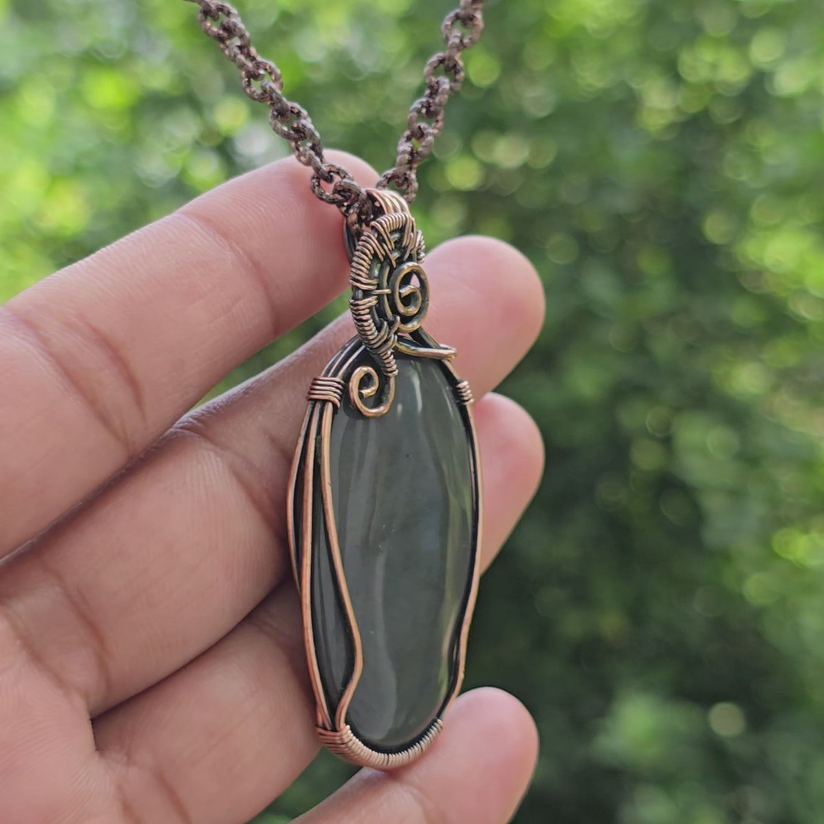 • This stunning Polychrome Jasper Gemstone Copper Wire Wrapped Pendant is a handcrafted piece of bohemian gemstone jewelry. The calming blue hues of Chalcedony are beautifully complemented by the rich tones of oxidized copper wire, making this pendant a perfect mix of elegance and natural beauty.