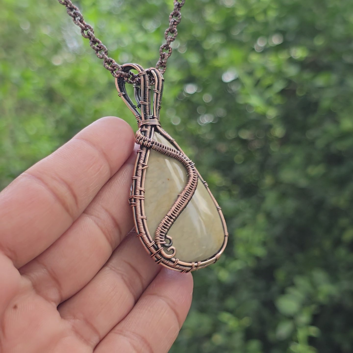 Polychrome Jasper Gemstone Handmade Copper Wire Wrap Chain Pendant 2.95"