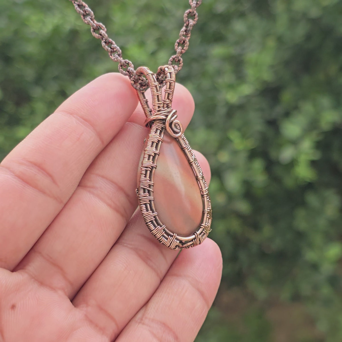 • This stunning Red Jasper Gemstone Copper Wire Wrapped Pendant is a handcrafted piece of bohemian gemstone jewelry. The calming blue hues of Chalcedony are beautifully complemented by the rich tones of oxidized copper wire, making this pendant a perfect mix of elegance and natural beauty.