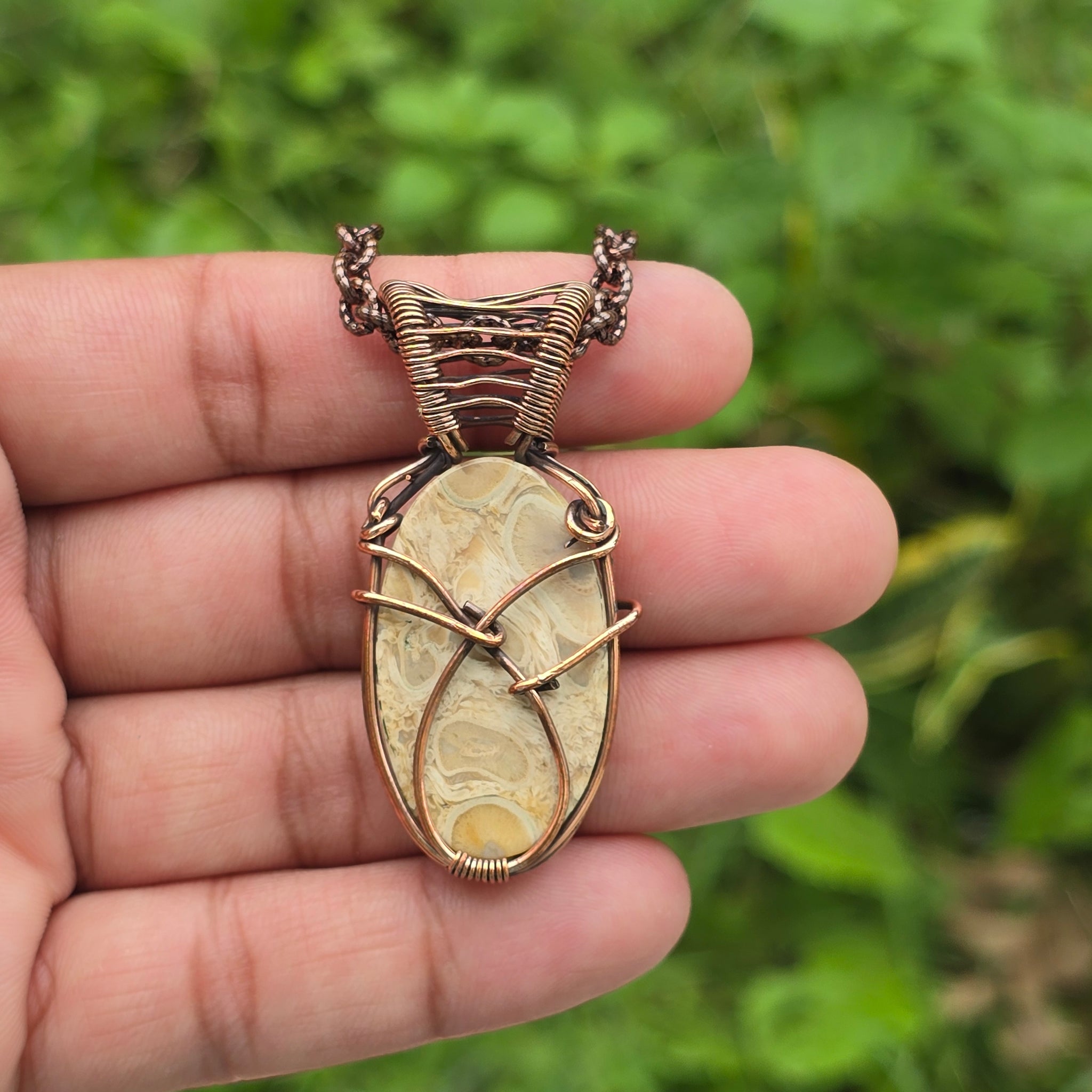 Root Palm Agate Gemstone Handmade Copper Wire Wrap Chain Pendant 1.96"