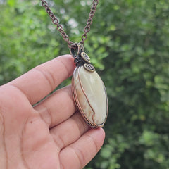 • This stunning Scolecite   Gemstone Copper Wire Wrapped Pendant is a handcrafted piece of bohemian gemstone jewelry. The calming blue hues of Chalcedony are beautifully complemented by the rich tones of oxidized copper wire, making this pendant a perfect mix of elegance and natural beauty.