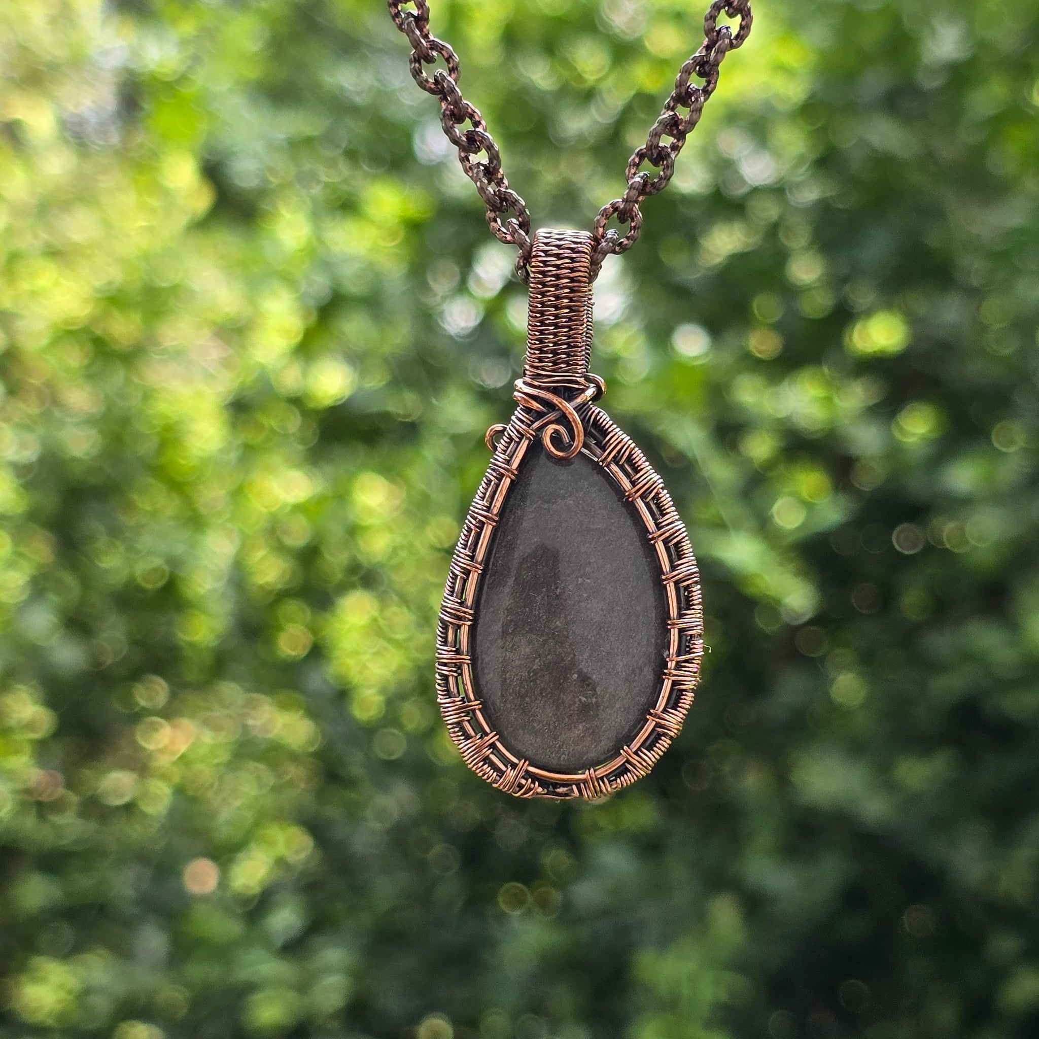 Silver Obsidian Gemstone Handmade Copper Wire Wrap Chain Pendant 2.16"