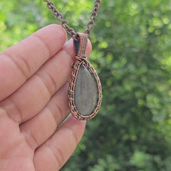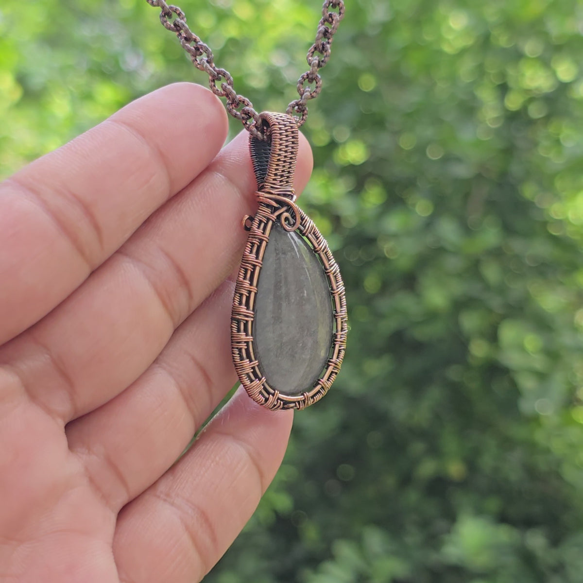 • This stunning Silver Obsidian Gemstone Copper Wire Wrapped Pendant is a handcrafted piece of bohemian gemstone jewelry. The calming blue hues of Chalcedony are beautifully complemented by the rich tones of oxidized copper wire, making this pendant a perfect mix of elegance and natural beauty.