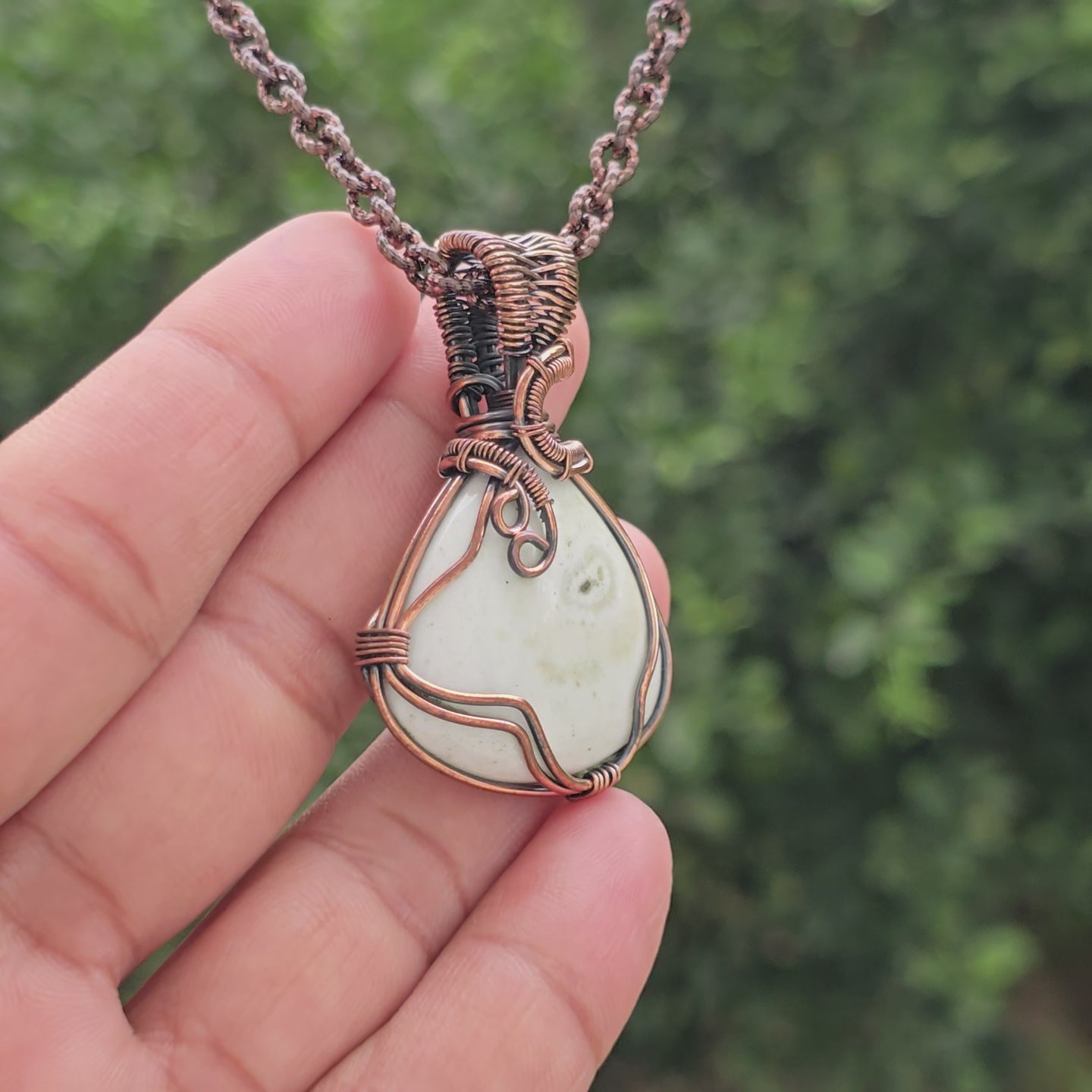 • This stunning Solar Quartz Gemstone  Copper Wire Wrapped Pendant is a handcrafted piece of bohemian gemstone jewelry. The calming blue hues of Chalcedony are beautifully complemented by the rich tones of oxidized copper wire, making this pendant a perfect mix of elegance and natural beauty.