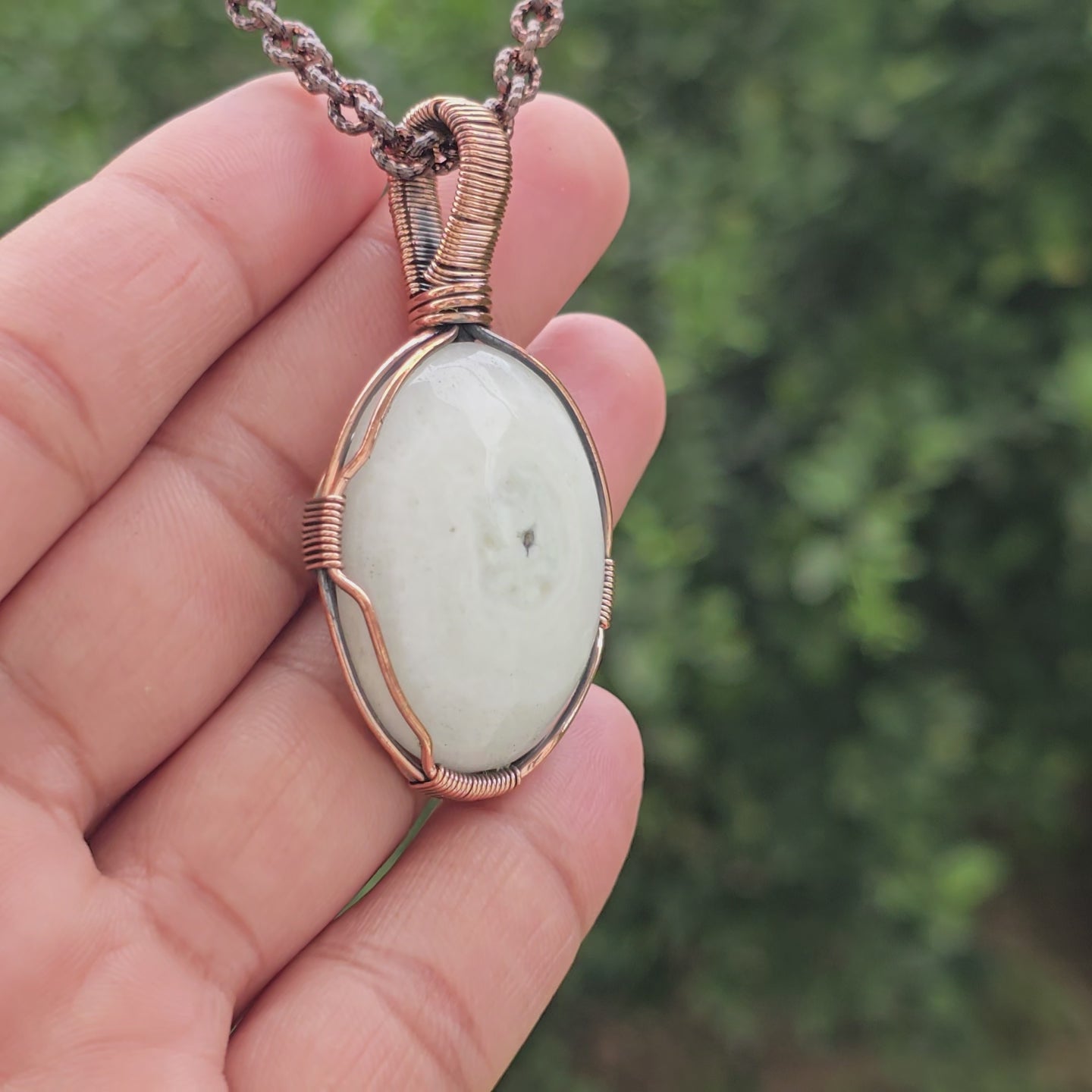 • This stunning Solar Quartz Gemstone Copper Wire Wrapped Pendant is a handcrafted piece of bohemian gemstone jewelry. The calming blue hues of Chalcedony are beautifully complemented by the rich tones of oxidized copper wire, making this pendant a perfect mix of elegance and natural beauty.