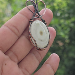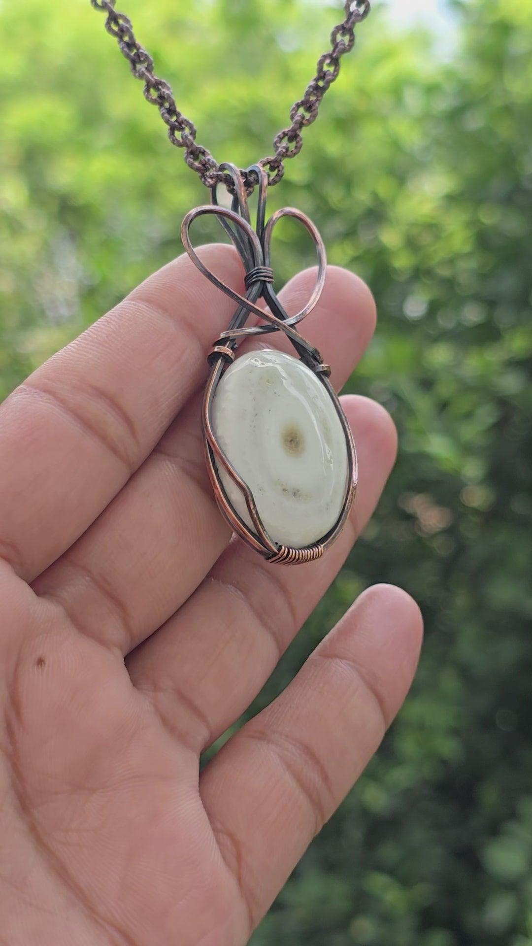 • This stunning Solar Quartz  Gemstone Copper Wire Wrapped Pendant is a handcrafted piece of bohemian gemstone jewelry. The calming blue hues of Chalcedony are beautifully complemented by the rich tones of oxidized copper wire, making this pendant a perfect mix of elegance and natural beauty.