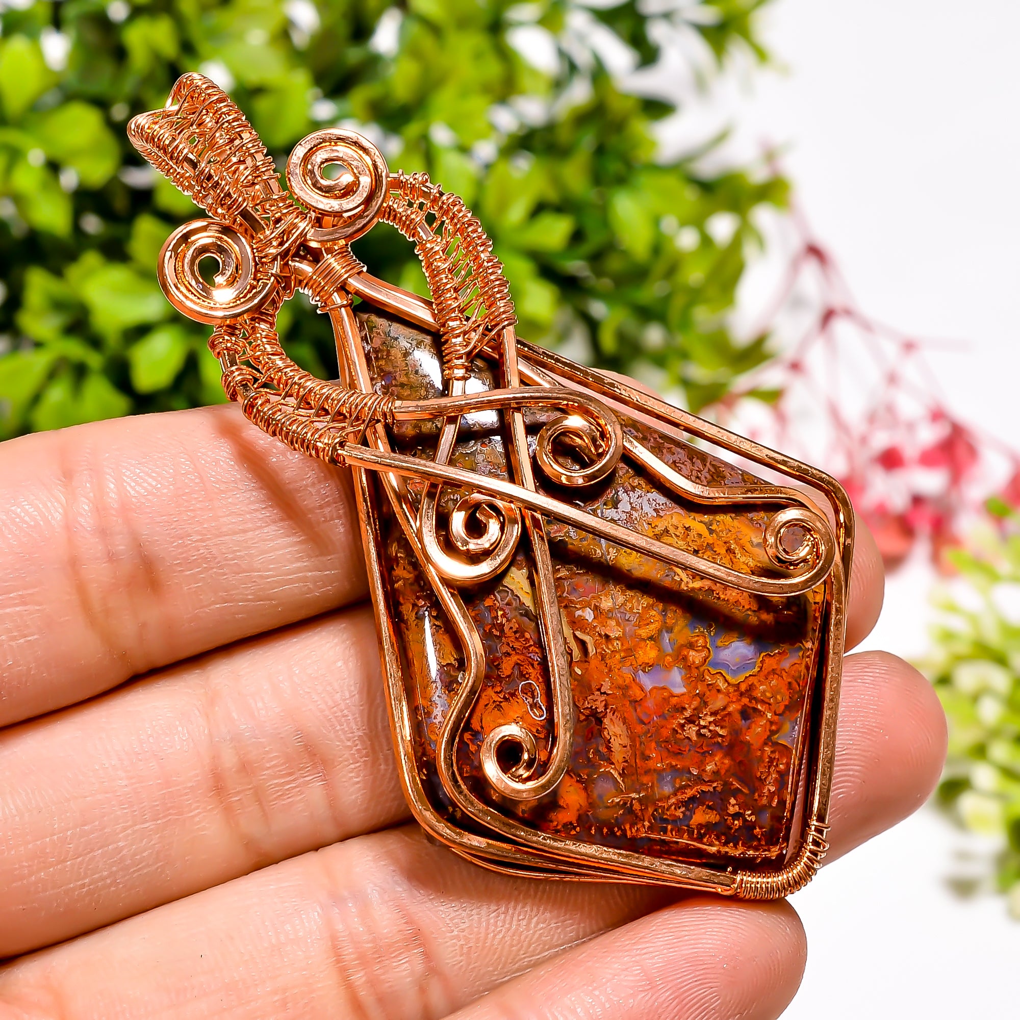Terrific Top Grade Quality 100% Natural Seam Agate Gemstone Shield Vintage Handmade Pure Copper Wire Wrapped Pendant 2.9" 26.3 gms. KR09-23